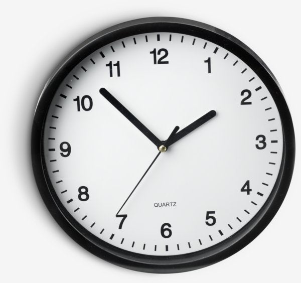 Ceas de perete negru, cu un design minimalist și cifre clare, ușor de citit.