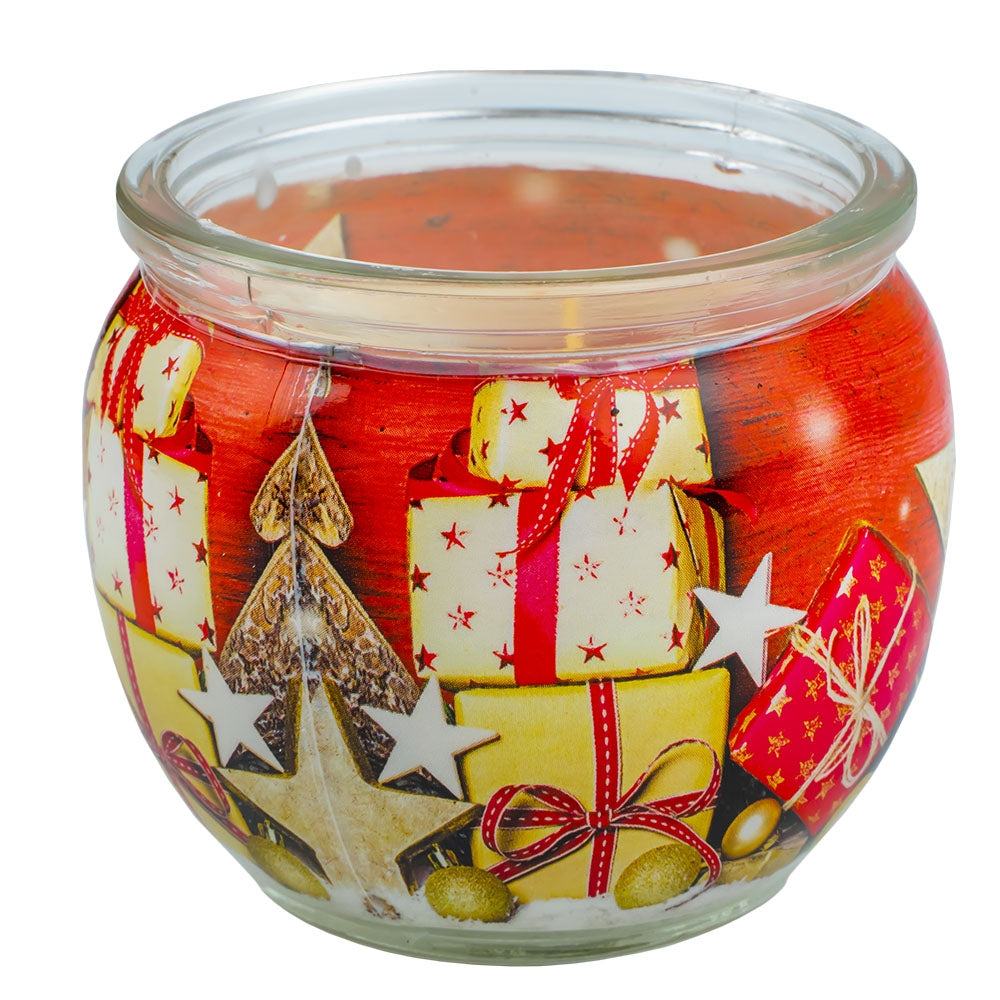 - Dispune de un vas din sticla bombat cu margine rasfranta, decorat cu folie cu imagini specifice sarbatorilor de iarna, cadouri de Craciun. Datorita bazei mari a vasului si greutatii, lumanarea este foarte stabila, iar datorita formei flacara este protejata de curenti de aer.