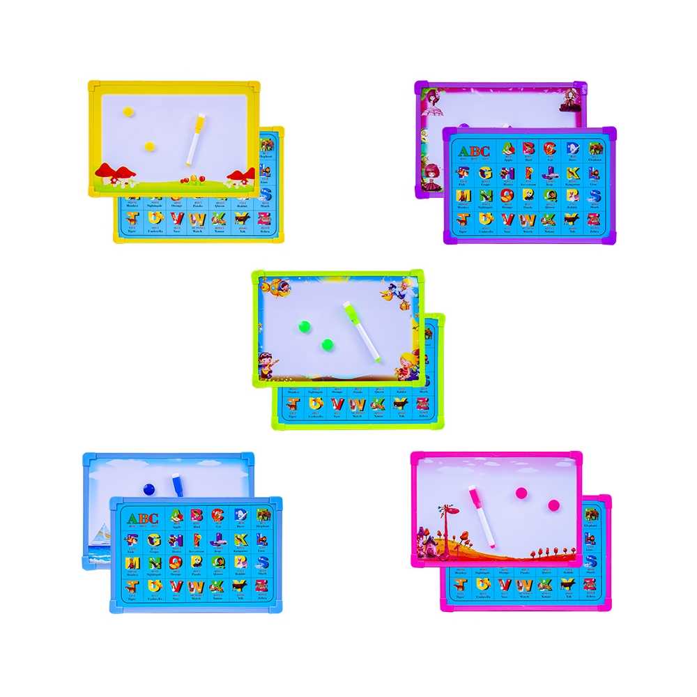 - Tablita are 2 fete. Pe una din fete copiii pot sa scrie sau sa deseneze, iar cu ajutorul celeilate pot sa invete alfabetul, fonetica engleza a alfabetului sau cuvinte in limba engleza.