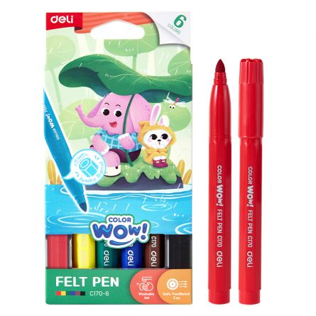 Set de 6 carioci jumbo Deli ColorWow cu vârf rotund rezistent, ideal pentru desenul creativ și activități artistice. Cerneala pe bază de apă se spală ușor de pe haine și majoritatea materialelor textile, oferind flexibilitate în utilizare. Capac ventilat asigură o durată mai lungă de viață a produsului, iar formula non-toxică le face sigure pentru copii. Perfecte pentru artă, desen și proiecte școlare.