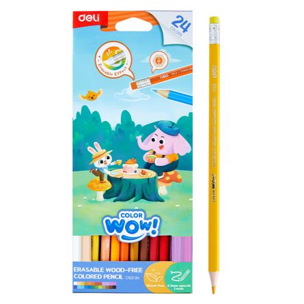 Creioane colorate cu radiera, gama ColorWow de la Deli. Fabricate din materiale prietenoase cu mediul, fara lemn, aceste creioane sunt mai usor de ascutit, mai sigure. Concepute avand in vedere sustenabilitatea. Corp hexagonal, forma ergonomica. 24 culori vii si luminoase. Mina de 3 mm grosime, rezistenta la rupere