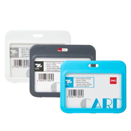 Ecuson orizontal din ABS rigid, ideal pentru identificare profesională în medii corporative sau educaționale. Construcția cu două fețe permite afișarea simultană a informațiilor pe ambele laturi, maximizând vizibilitatea. Echipat cu clips metalic și șnur textil rezistent pentru purtare confortabilă pe toată ziua. Spatul rabatabil facilitează introducerea și schimbarea rapidă a cardurilor (54 x 86 mm), fără necesitatea deschiderii complete. Disponibil în culori asortate pentru diferențiere ușoară între departamente sau categorii. Dimensiuni exterioare: 100 x 80 mm. Soluție durabilă și economică pentru organizații care necesită identificare zilnică.