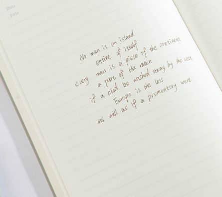 Caiet de birou, format A5, cu 96 de file, dictando, de culoare alba. Hartie, nuanta ivory, cu grosimea de 80g/mp. Coperta imitatie din piele cu textura neteda, placuta la atingere.