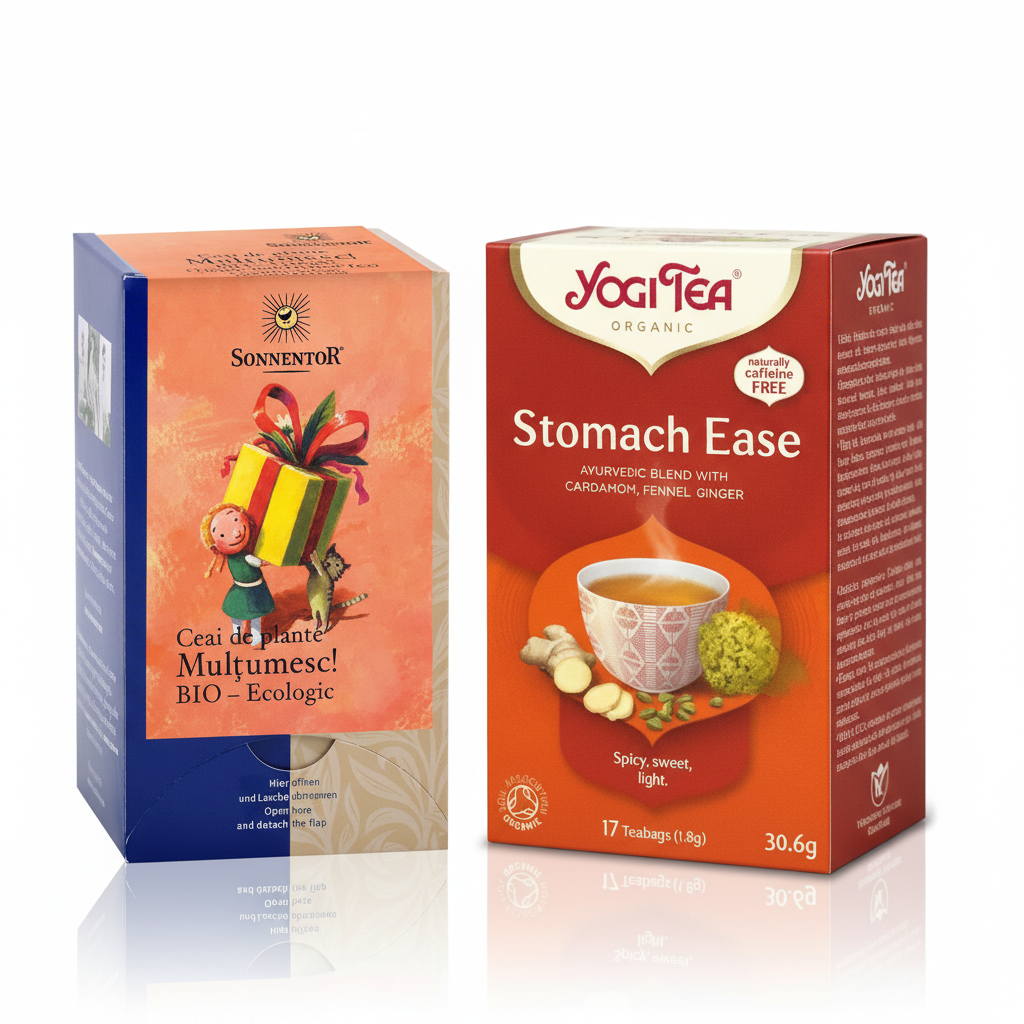 Alături, ceaiul bio Digestiv Yogi Tea, cu fenicul, mentă, coriandru, cardamom și ghimbir, susține echilibrul interior, digestia și detoxifierea naturală, oferind o experiență reconfortantă și aromată. Împreună, cele două ceaiuri creează un pachet armonios, potrivit atât pentru cadou, cât și pentru ritualul personal de wellness.
