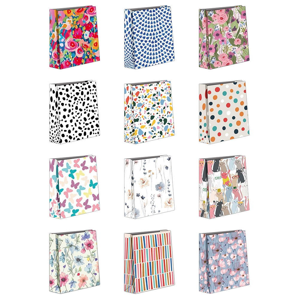- Pungile sunt confectionate din hartie de 128 g/m2, cu una din fete alba si cealalta laminata, lucioasa, cu diverse imprimeuri colorate. Setul contine pungi cu 6 modele diferite de imprimeu.