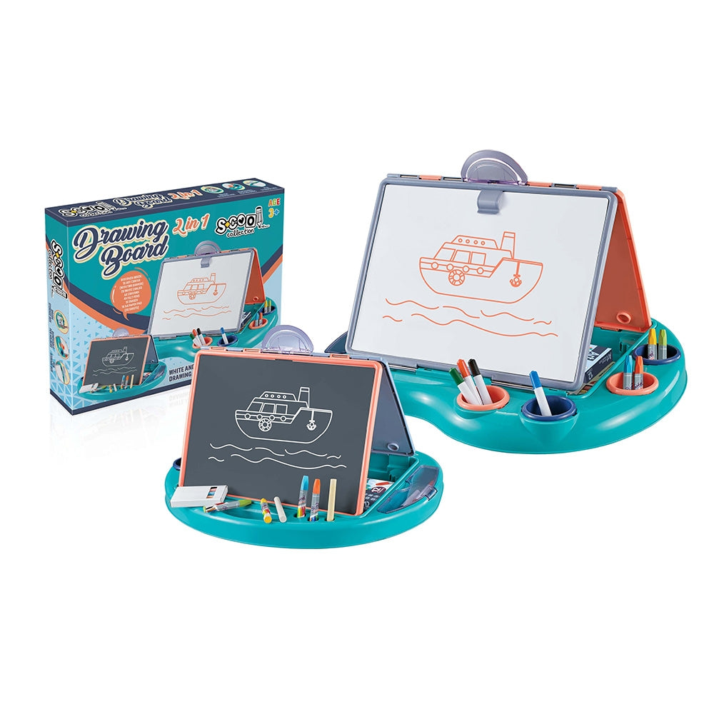 - Cutia contine: 1 x 2 tablite diptic (doua tablite cu balama), 2 x crete albe, 6 x creioane, 4 x carioci, 1 x radiera, 1 x bloc de hartie A4 (20 coli), creta alba si neagra, planse de desen intr-un singur set, cutie de depozitare.